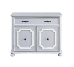 Classic yet a bit romantic, versatile, the Enyin Cabinet keeps your space neat, organized, and attractive. Crafted from wood, this cabinet is graced with beautiful wood carving details, while vintage bun feets added to it for elegant support. A muted grey finish softens the sturdy wooden frame, making it blend into any room or decor. The cabinet offers a large drawer and two doors for ample storage spaces. The storage drawer features double floral design knobs with a romantic flair. It is spacious enough to keep all of your personal stuff. Under the drawer is an extra storage space accented by double doors that open to reveal two-tier shelves.