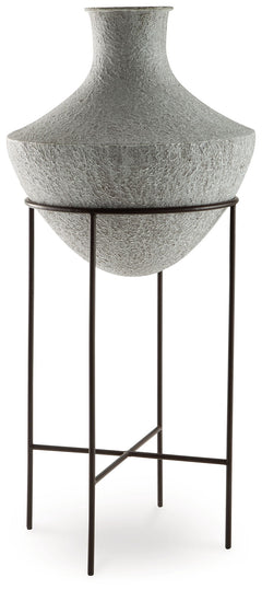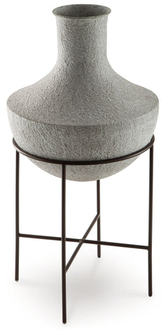 Take an effortlessly inviting approach to floor decor. This vase's distressed, textured look in a neutral hue pairs with a variety of casual color palettes. An espresso brown stand adds charming contrast to the look. And this vase enthusiastically welcomes faux florals and filler, perfectly adapting to the seasons when you swap out your arrangements.