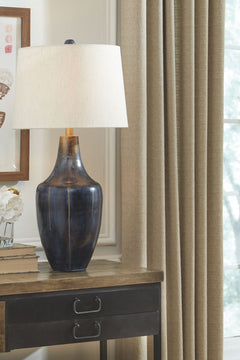- Made of indigo and goldtone metal with fabric modified drum shade