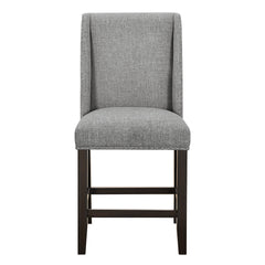 The Faust Upholstered Parsons Counter Dining Chairs offer a blend of luxury and durability, making them an excellent addition to any dining space. This set includes two Parsons counter chairs, each crafted from solid rubberwood and eco-friendly manufactured woods to ensure strength and durability. The solid wood legs and base stretchers provide extra stability, making these chairs a reliable choice. The 100% polyester tweed fabric fully upholsters the chairs, offering a soft, comfortable, and easy-to-clean surface. Featuring a sleek, contemporary design, the chairs are enhanced with decorative nailhead trim along the edges, adding a touch of elegance and sophistication. The dark wooden legs create a striking contrast to the light gray upholstery, resulting in a balanced and modern aesthetic. Ideal for those seeking a combination of style, comfort, and durability, the Faust Parsons Counter Dining Chairs are perfect for elevating your dining area.