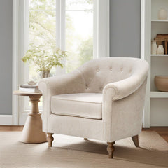 - Classic Features: Farmhouse accent chair with rolled arms, button tufting, and turned leg style.