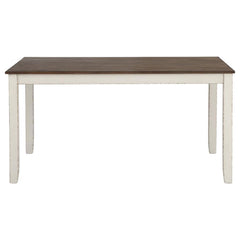 Complete your modern farmhouse dining room with this seven-piece dining set. Complete with one dining table and six side chairs, it offers a matching vintage white finish that lends a country charm. The spacious, rectangular dining table also features a chestnut colored, sandblasted wood tabletop with a dry brushed weathered finish. Each of the six chairs have a sturdy solid wood frame and flared backrests with open double-cross designs. Rest comfortably on their cushioned seats, wrapped in a high performance fabric in a grey hue that complements numerous color palettes.