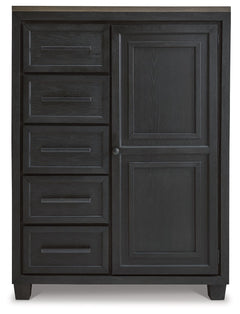 This door chest is casual contemporary style simply done right. Its two-tone color scheme features a rich brushed black main color accented with a beautiful dusty grayish brown wood tone. And there's plenty of storage to accommodate your wardrobe needs with ease. The dresser has 5 soft-close drawers, and behind the door you'll find pull-out trays for shoes or other accessories, along with shelving for bulky items.