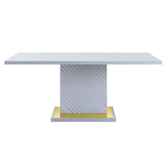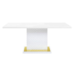 The sleek clean-lined table Gaines dining table offers subtle a hint of glam, the base offers a touch of gold to enhance the textured vertical lined pedestal. The white high gloss finish reflects light and makes any dining space appear larger and grander. Ample enough to showcase an impressive spread for all your guests to enjoy.