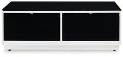 Combining a high-gloss white finish with a black glass tabletop, this coffee table proves opposites really do attract. It's the perfect blend of modern style and functionality, with two roomy drawers for storing essentials and a large open display shelf for decorative items. Want to rearrange the furniture? Casters make it easy to adapt to any situation.