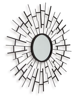 This accent mirror makes a bold statement in contemporary and industrial spaces. Framed with sunburst-style metal fretwork and finished in a luxe black, it's a fabulous blend of form and function.