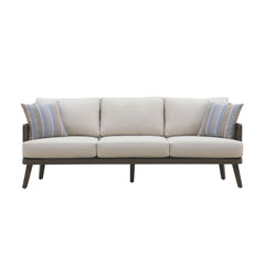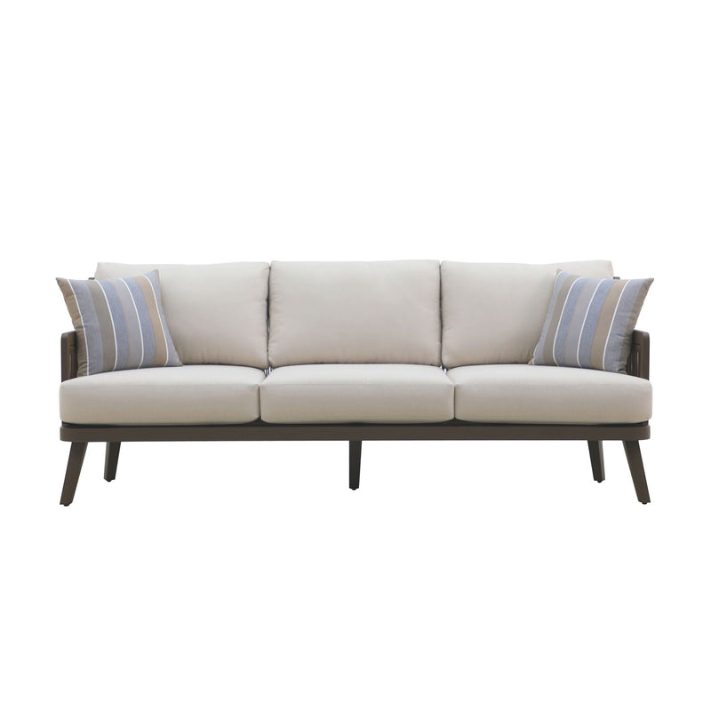 The Genova Patio Set, featuring a spacious patio sofa and a stylish coffee table, effortlessly combines durability, comfort, and modern sophistication for any outdoor space. Built with durable aluminum frames and a baked-on powder coat finish, this set offers superior scratch resistance and long-lasting performance. Designed for all-weather durability, the furniture is wrapped in high-density PE wicker, an eco-friendly synthetic resin that provides the classic look of wicker with the added benefits of being low-maintenance, colorfast, and resistant to water, mildew, and fading. The sofa features plush 6 ½" high-density foam seat and back cushions upholstered in premium light gray Sundura™ fabric—a solution-dyed 100% polyester that resists fading, mildew, and moisture, ensuring vibrant color and lasting protection season after season. The coffee table’s slatted top adds a classic touch while promoting water drainage for added practicality. Designed with clean lines, neutral tones, and a woven rope seat back, this set delivers an open, airy feel with solid structural support. The minimalist design is enhanced by evenly spaced vertical strands, bringing a refined texture and contemporary elegance to any outdoor setting.