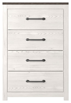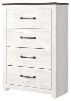 Cool, clean and casually modern. This chest’s wispy whitewash and gray finish sets the tone for your calming sanctuary. Large linear pulls add dimension and authenticity. Four smooth-gliding drawers neatly accommodate your wardrobe needs.