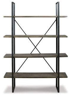 Got books? Bring them to this bookcase. Its industrial mix of dark wood and black metal brings trendsetting vibes to your home. Four sturdy shelves hold your belongings with ease. Mix in some metallic decor for a home office look you can’t refuse.