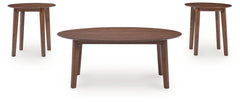 Stylish simplicity teams up with mod flair to define this table set. A versatile and inviting brown wood-tone finish on the coffee table and end tables enhances the stunning wood grain character. Rounded tops polish off the design with a dash of mid-century appeal.