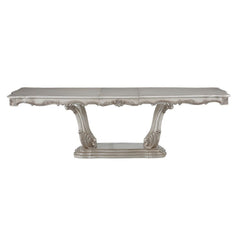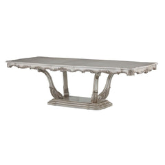 Exclusively designed and filled with romantic spirit, this beautiful rectangular table features a pedestal base with Queen Anne legs and carved apron and trim, decorated with raised and scrolled floral motifs in a golden ivory finish. This stylish and detailed collection is ideal for a large gathering and will add elegance to any dining room Decor.