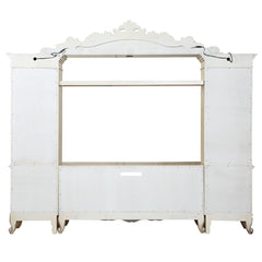 Exclusively designed and filled with romantic spirit, the beautiful Gorsedd entertainment center features Queen Anne legs and carved apron and trim, decorated with raised and oversized scrolled moldings in a golden ivory finish. This sophisticated living room unit has matching case pieces including a center TV stand and large left and right facing piers with mirrored backs, ensuring plenty of unique storage and display space. The collection boasts of multiple glass doors and glass display shelves and an elegantly arched and lighted center bridge. This stylish and detailed piece is ideal for entertaining guests and will add elegance to any living room Decor.