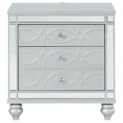 Bring modern glam to a classic design with this transitional two-drawer nightstand. It features a glitzy design that draws the eye in any modern home. It's crafted with a vibrant silver metallic finish with fret work detail on the front panels and drawer fronts. The drawers are adorned with crystal-like pulls and the top one is lined with black felt. Dual USB ports and delicate bun feet complete the design of this exquisite accent piece.