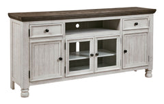 Have your fill of modern farmhouse style with this TV stand. Its distressed two-tone finish pairs a vintage white with a weathered gray for a look that’s utterly charming. Right and left cabinets open to reveal adjustable shelving for all your entertainment center storage needs. Center glass doors add to its relaxed appeal.