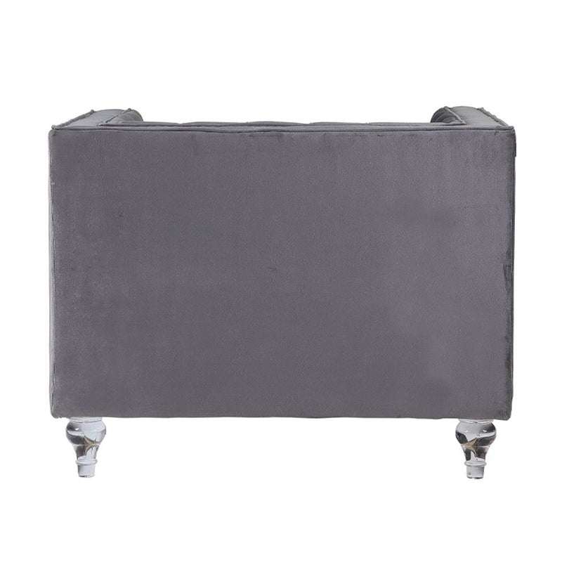 Impressive and bold, the Heiberoll living room collection is sure to impress your guests. The set includes mirrored side trim with faux diamonds to add a glimmering touch. The whimsical acrylic turned legs give off the illusion that the pieces are floating. The collection is upholstered in a plush velvet that feels silken to the touch. Ultra-comfortable seats and a sturdy wooden inner frame make this piece a joy to lounge on. Classic nailhead trim and button tufting finish off this glamorous set. Available in two colors pink and gray.