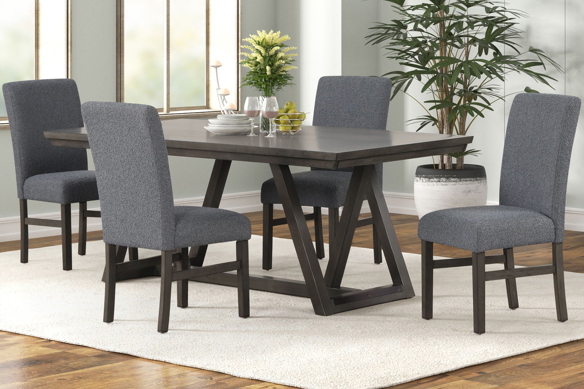 The High Line Dining Set is designed to be the centerpiece of your dining experience. Including one trestle dining table and upholstered side chairs, this set is built to last, expertly crafted from solid Acacia and Rubberwood, enhanced with high-quality manufactured woods and Birch veneers, ensuring unmatched durability and stability. The meticulously hand-applied, multi-step finish features a smooth, matte hue with sophisticated undertones, creating a modern, sleek ambiance that fits perfectly in contemporary spaces. The chairs, upholstered in luxurious bouclé fabric, offer exceptional durability and comfort, making them ideal for frequent use. The unique looped texture adds both elegance and longevity to your dining area. The table’s flat, rectangular top and crisscross leg design emphasize functionality and simplicity, making it a versatile addition to any room, from dining areas to workspaces. This dining set comfortably seats up to six guests, with the plush chairs upholstered in easy-care polyester fabric, blending elegance with practicality. Make this unparalleled dining set a marvel of your home, combining style, comfort, and lasting quality.