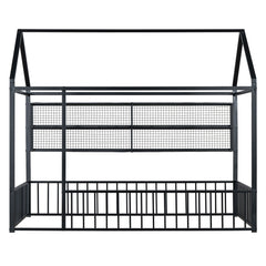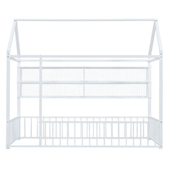 This stylish metal bed frame features a unique house-shaped design, adding a playful yet modern touch to any bedroom. With sturdy metal construction, it ensures long-lasting durability and a secure night's sleep. The back of the bed is equipped with four convenient metal grid shelves, providing extra storage for your essentials while maximizing space. This bed frame blends functionality with a whimsical design, making it a standout piece in any room.
