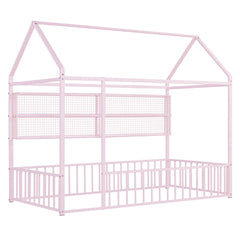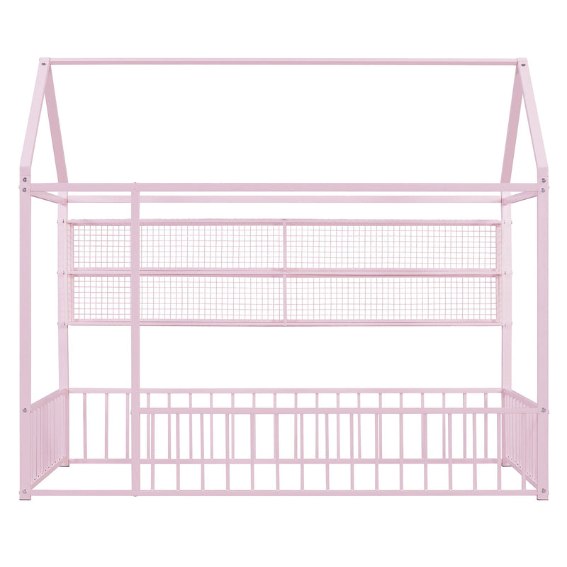 Full Size Bed House Frame With Fence And Shelves - Pink