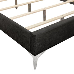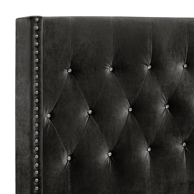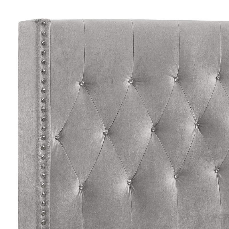The Huxley Upholstered Bed in Gray combines contemporary glam with durable construction for a stylish and comfortable bedroom centerpiece. This set includes a headboard, footboard, two side rails, and a slat kit, all crafted from manufactured woods and eco-friendly decorative laminate for long-lasting use. The bed features clean lines and a crystal button-tufted headboard with silver studded trim, offering a touch of luxury and comfort. Its inviting finish provides a sleek, modern look that complements contemporary interiors, creating a sophisticated and calming atmosphere. The neutral tone pairs beautifully with the metallic accents and luxurious upholstered headboard, adding a touch of glamour and cohesion to the overall design. The 100% polyester velvet fabric exudes elegance with its soft feel and plush padding, ensuring maximum comfort.