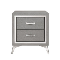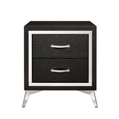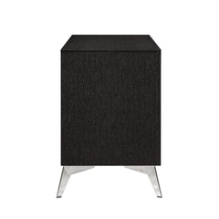 The Huxley 2-Drawer Nightstand offers a blend of contemporary glam and durable construction for your bedroom. This nightstand is carefully crafted from manufactured woods and eco-friendly decorative laminate, ensuring it will last for years. The design features clean lines with metallic accents and flared silver legs for a modern touch. Its rich finish provides a sleek, sophisticated look that is both timeless and modern, with bold highlighting the metallic accents and smooth surfaces for a chic, polished aesthetic. The quality drawer construction includes English dovetail joinery and smooth-rolling center glides for long-lasting operation. Functional and fashionable, this nightstand provides ample storage for bedside essentials, with chic, crystal-studded drawer pulls for easy access.