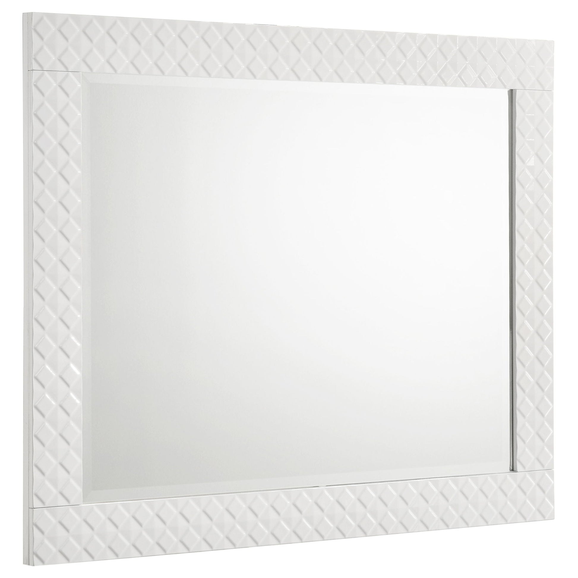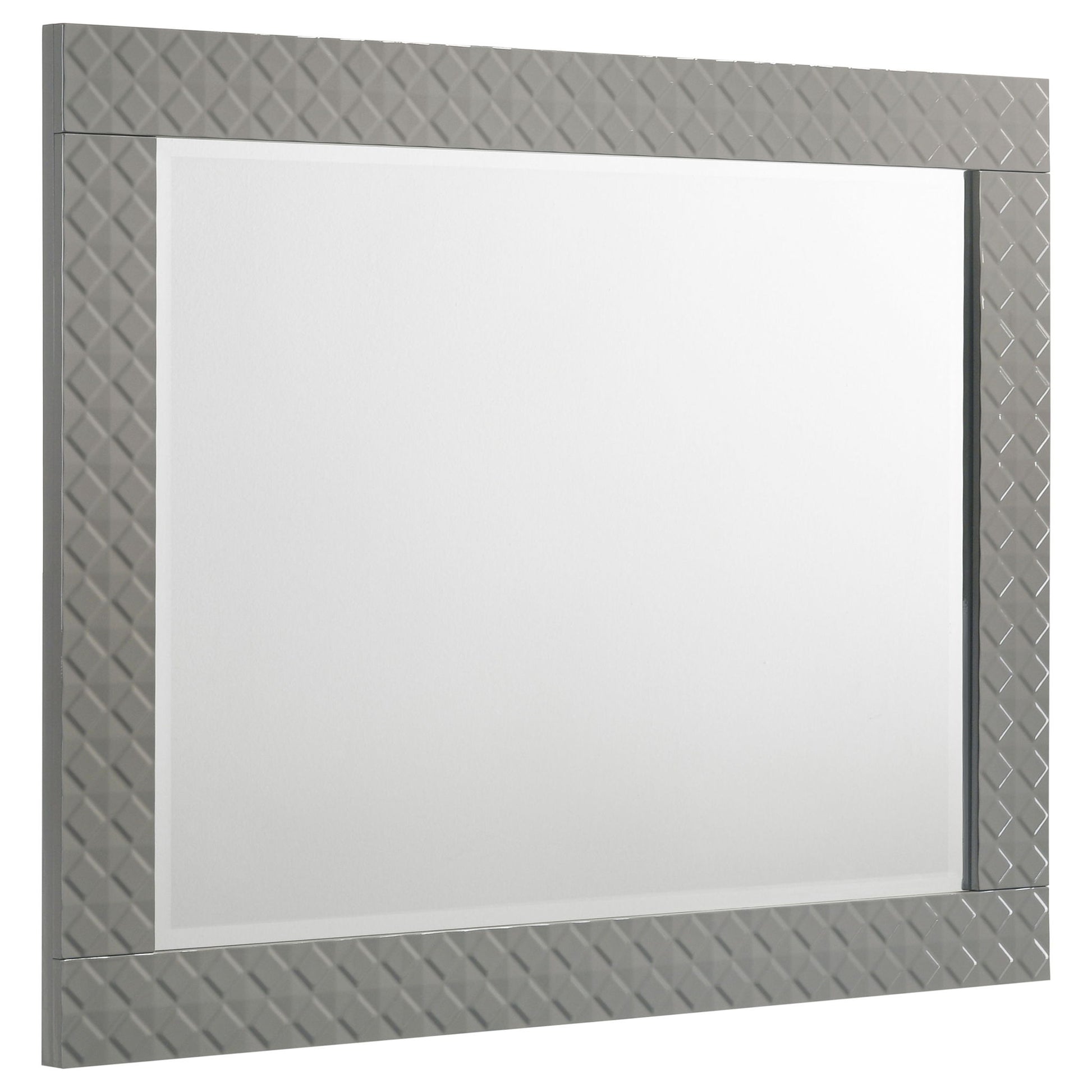 Complete your dresser with this elegant mirror, designed to enhance the modern aesthetic of your bedroom. The high gloss finish and 3-dimensional diamond tile emboss perfectly complement the dresser, creating a cohesive look. This mirror features a sturdy frame crafted from solid materials, ensuring both style and durability. Its generous size offers ample reflection, making your space feel larger and brighter. This mirror is the perfect finishing touch to elevate your bedroom decor.
