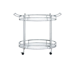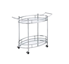 Instantly transform an ordinary room in to a minibar with this brilliant accessory. Two clear glass shelf allow you to display delicious drinks and delicate glassware. Supporting metal frame features a simplistic silhouette with chrome finish giving a modern touch. Two handle design and wheel stop make it easy to move around and place it where needed.