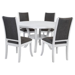 Embrace a modern minimalist presentation with this contemporary dining set. It centers on a roomy round dining table that seats four to six, with flared legs and a round shelf that adds stability and decorative potential. The set adds side chairs, each with a tall, structured silhouette and dark gray upholstery over plush foam cushions. A pearl white finish is clean and fresh, offering plenty of contrast against the gray. The set instills a clean, precise aesthetic, perfect for minimalist or maximalist decor themes.