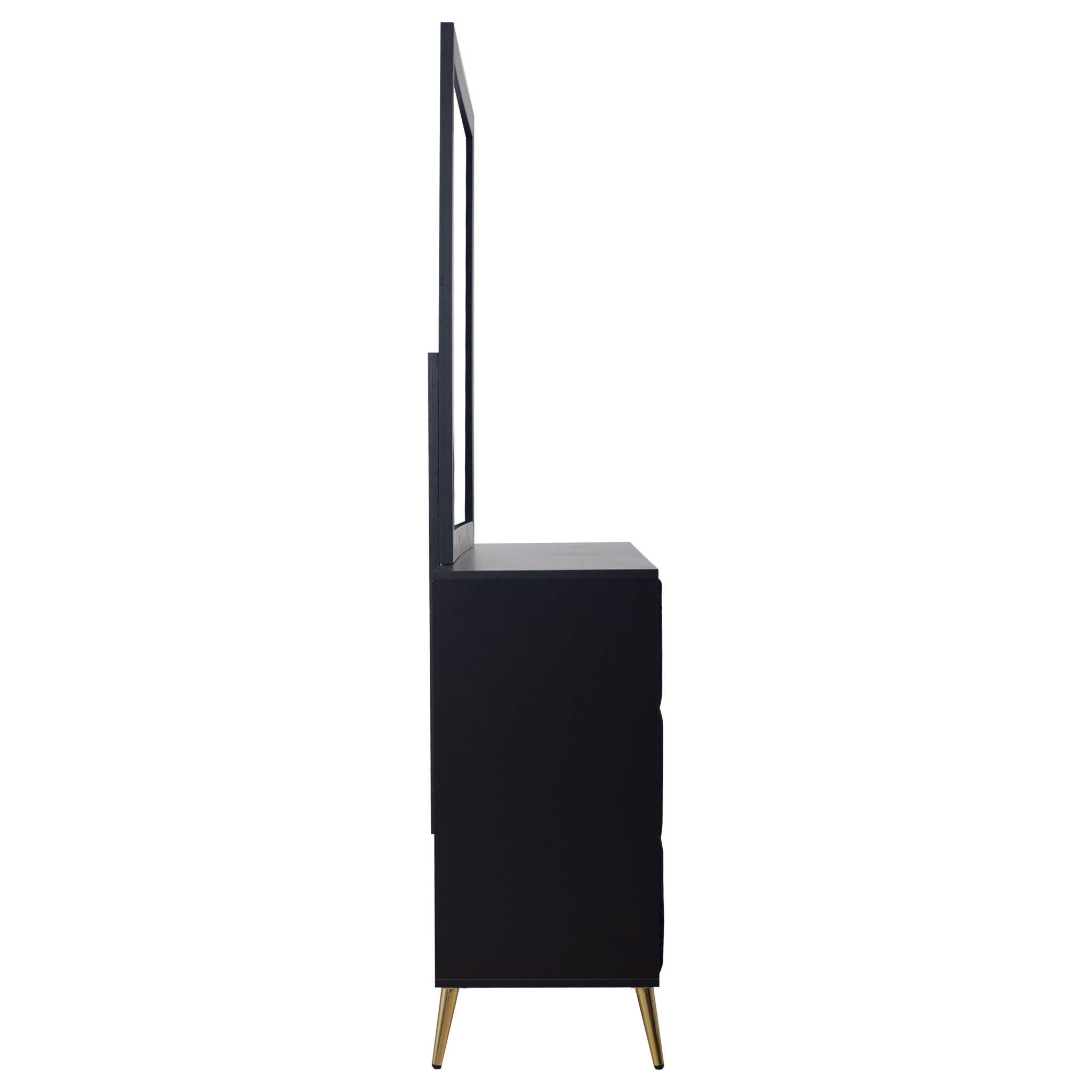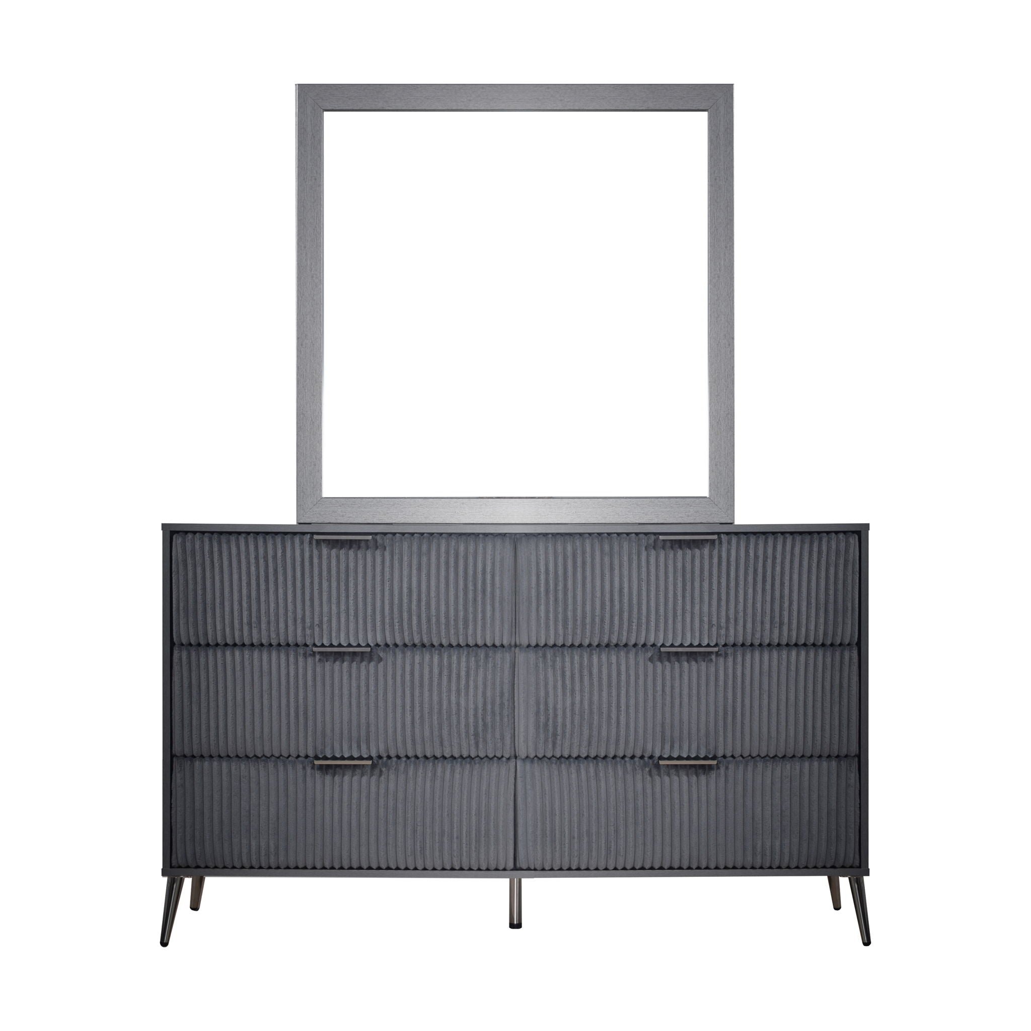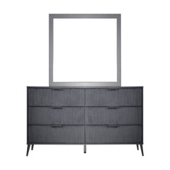 The Kailani 2 Piece Dresser and Mirror Set is a stunning combination of modern design, durability, and eco-friendly craftsmanship, making it an elegant addition to any bedroom. This set includes a dresser and mirror, both expertly crafted from a blend of solid rubberwood, engineered wood, and eco-friendly decorative laminate. The durable construction ensures the furniture maintains its beauty with minimal maintenance, offering superior resistance to scratches, moisture, and stains. The modern minimalist design, featuring clean lines, a sleek silhouette, and a chic ribbed texture, is enhanced by slim metallic handles and tapered legs, adding a sophisticated yet functional touch to your space. The dresser’s textured drawers, wrapped in luxurious 100% Polyester Velvet and accented by gleaming gold pulls and angled legs, bring a touch of glamour to the room. The low-distortion mirror offers crystal-clear reflection, combining both function and elegance. Thoughtfully designed for seamless form and function, the spacious drawers glide effortlessly on full-extension slides and are reinforced with durable dovetail joinery, ensuring smooth operation and lasting strength. The Kailani Dresser and Mirror Set is a perfect blend of style, function, and sustainability, making it a standout choice for your bedroom.