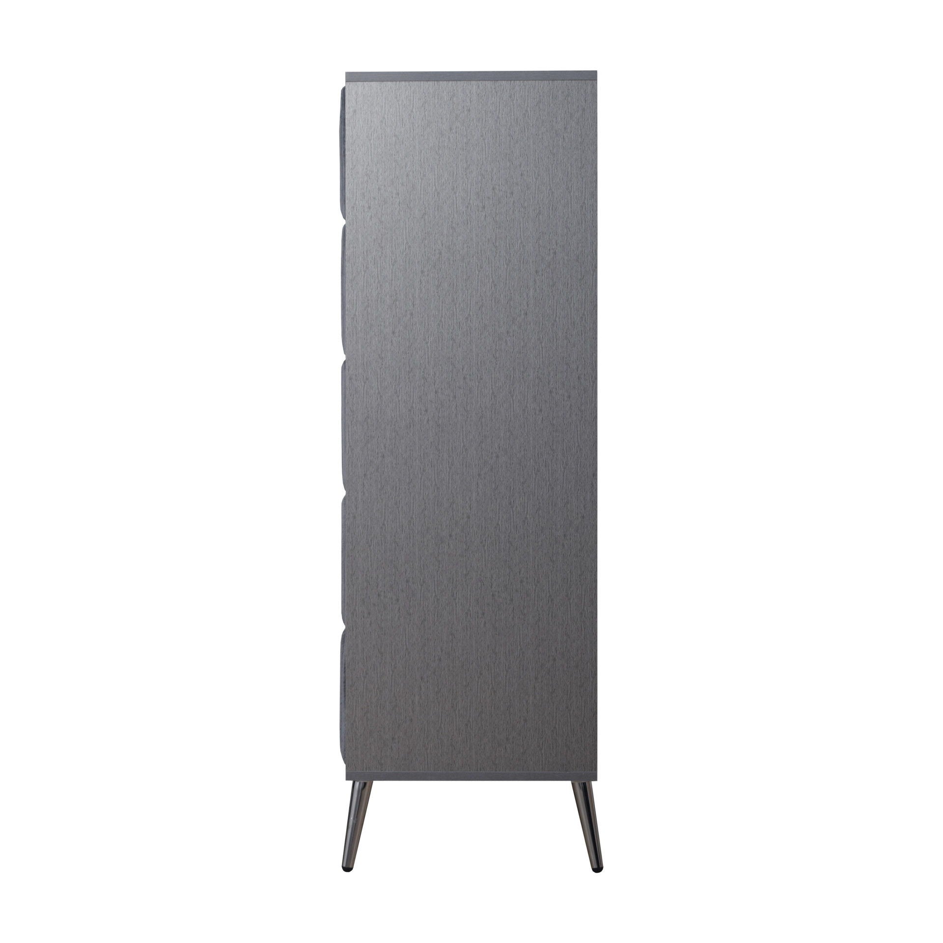 The Kailani 5 Drawer Chest is a perfect blend of modern design, durability, and eco-friendly construction, making it an ideal addition to any bedroom. Expertly crafted from a mix of solid rubberwood, engineered wood, and eco-friendly decorative laminate, this chest offers lasting style and sustainability. The laminate finish not only enhances the chest's appearance but also provides superior resistance to scratches, moisture, and stains, ensuring its beauty with minimal maintenance. The chest features a modern minimalist design with clean lines, a sleek silhouette, and a chic ribbed texture, complemented by slim metallic handles and tapered legs that add both elegance and durability. The drawers, wrapped in luxurious 100% Polyester Velvet and accented by chrome pulls, bring a touch of sophisticated glamour to your space. Each drawer is designed for seamless functionality with fully finished interiors, full-extension slides, and dovetail joinery, providing smooth, snag-free storage and lasting strength. The Kailani 5 Drawer Chest combines style, function, and sustainability, making it a standout piece in any modern bedroom.