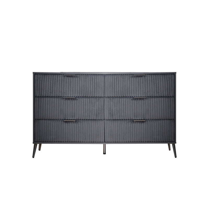 The Kailani 6 Drawer Dresser combines modern minimalist design with durable, eco-friendly construction, making it a stylish and sustainable choice for any bedroom. Crafted from solid rubberwood, engineered wood, and eco-friendly decorative laminate, this dresser is built to last with resistance to scratches, moisture, and stains, ensuring long-term beauty with minimal upkeep. The dresser features clean lines, a sleek silhouette, and a chic ribbed texture, complemented by slim metallic handles and tapered legs that enhance its contemporary appeal. Wrapped in luxurious 100% Polyester Velvet, the textured drawers are accented by chrome pulls and glide effortlessly on full-extension slides, with dovetail joinery providing lasting strength and smooth operation. This dresser not only adds a touch of sophisticated glamour to your space but also offers practical, snag-free storage, making it a perfect blend of form and function.