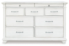 Give your retreat vintage charm and valuable drawer storage with this dresser. In a beautifully distressed whitewash finish, you'll love putting it all away in casual style. Seven full-sized drawers and two accessory top drawers will easily accommodate your needs. Generously scaled moulding from top to bottom, along with bun feet and drawer handles with a transitional aesthetic, give this dresser character—evoking the feel of a quaint cottage escape.