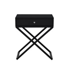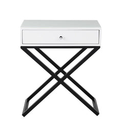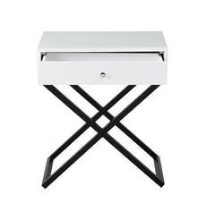 - Organize and declutter with the Koda side table. Place this table as a nightstand to your bed or as an end table in your living room. The one drawer with silver knob provides storage space for your everyday necessities. The finely crafted tabletop works perfectly for your lamp, picture frames, and any other decorative items for display. The MDF tabletop has a tempered glass for a contrasting material. The base is not only designed with an attractive black cross leg, but also solidly built with sturdy metal legs. Available in other colors that will complement your home's specific decor.