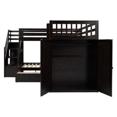 Twin Twin Over Full L Shaped Bunk Bed With 3 Drawers, Portable Desk And Wardrobe - Espresso