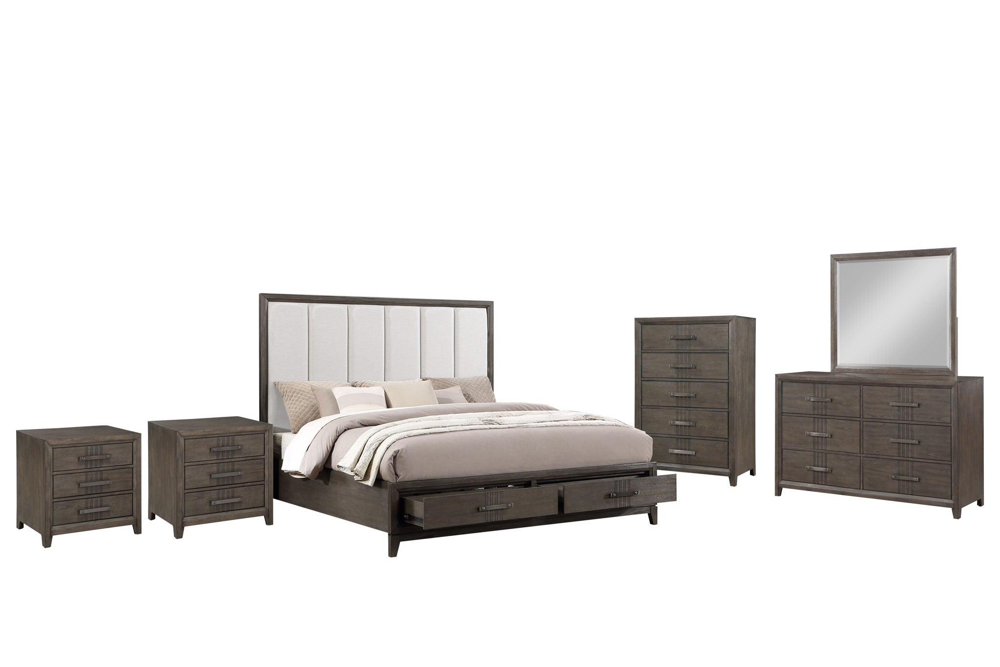 The Landon Wood Platform Bedroom Set is a perfect blend of durability, style, and functionality, ideal for creating a modern and organized bedroom. Crafted from solid Pine, high-quality engineered woods, and genuine Mindi wood veneers, this set is built to last while preserving the natural allure of wood with its multi-step finish and subtle undertones. The plush, channeled-back headboard, upholstered in natural fabric, adds a cozy and elegant contrast to the warm tones of the set. With ample storage options, the dresser, chest, and two nightstands offer spacious and meticulously crafted dovetailed drawers that glide smoothly on full-extension tracks. The footboard also features two additional drawers, perfect for storing linens, clothing, or other essentials. The platform bed's design, supported by 13 sturdy slats, provides reliable mattress support without the need for a box spring, ensuring a sleek, low-profile look. Thoughtful details like velvet-lined top drawers and modern flat bar pulls enhance the furniture's design, making the Landon Bedroom Set both a stylish and practical choice for your home.