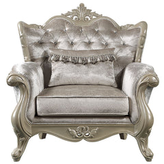 The Libertee collection sofa set is a blend of classic elegance and modern comfort. Finished in champagne, this set features a KD back, legs, and armrests with a wooden inner frame. The tight back and loose seat cushions, constructed with pocket coils, ensure lasting comfort. Adorned with button tufting, floral trim apron, and legs, it includes accent pillows and a matching wooden tabletop. This exquisite set promises to elevate any living space with its refined charm.