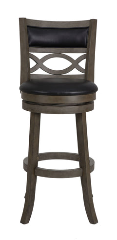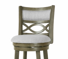 The New Classic Furniture Manchester Pub Height Swivel Bar Stool is a functional and durable seating solution designed for comfort and style. Crafted from quality Rubberwood solids and manufactured wood, ensuring long-lasting strength. Featuring a seat height of 29”, the stool's legs are reinforced by a circular footrest, providing added stability and functionality. With a 360-degree swivel, this barstool effortlessly rotates for convenient use at kitchen islands or bars. The full foam seat cushions and backrests, upholstered in easy-care light gray 100% polyester fabric, offer a plush and cozy seating experience. The distinctive interlocking wave wood back and thickly welted upholstery add a touch of sophistication to the overall design. Easy assembly is a snap with the included instructions. Elevate your bar, counter, or kitchen island with the Manchester Bar Stool, where durability meets distinctive style.