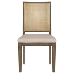 A trio of natural hues brings refined but casual character to a modern farmhouse dining chair. Perfect for friends and family enjoying delicious meals, the chair features a plush foam seat with beige upholstery. Its back is rattan, adding texture and character while maintaining a light, airy look and feel that's rich and breathable. Its classic stance features an armless silhouette complete with a gently angled back and straight, tapering legs. The natural finish of the wood offers a refined but accessible look, perfect for inviting family spaces.