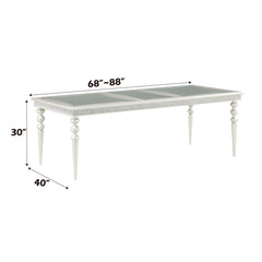 Make your dining room the centerpiece of your home with the Maverick dining set. This unique set comes in a platinum finish and sparkling rhinestone. The removable extension leaf which will create plenty of seating space and a welcoming place for all those who gather for a meal. Enhance your dining area with this stunning set.