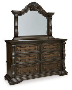 From the ornamental appliques to the large scale, this dresser and mirror make a bold statement. Spacious drawers store your clothes, jewelry and more in stunning style. The look is timeless. The feel? Right at home.