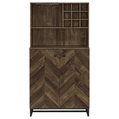 This rustic bar cabinet features a striking herringbone pattern and a warm oak finish, perfect for enhancing any living or dining space. With ample bottle and stemware storage, it offers function and flair in equal measure. The mixed material construction and clean lines bring modern charm to your home entertaining setup.