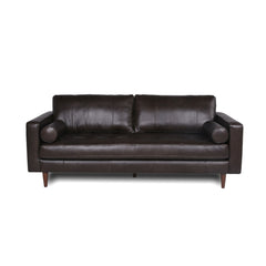 Make a mid-century modern statement in the middle of your living room with this sofa. It's built with a solid kiln-dried hardwood frame and features square track arms, a low back, and tapered legs for that classic retro silhouette. The genuine leather upholstery has a foam fill with a spring seat construction for just the right amount of support that bounces back. The bench seat cushion is decorated with button tufting, while the back cushions have stitch details for a tailored touch. Two included bolster pillows add some extra cushion and support.