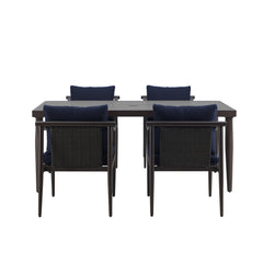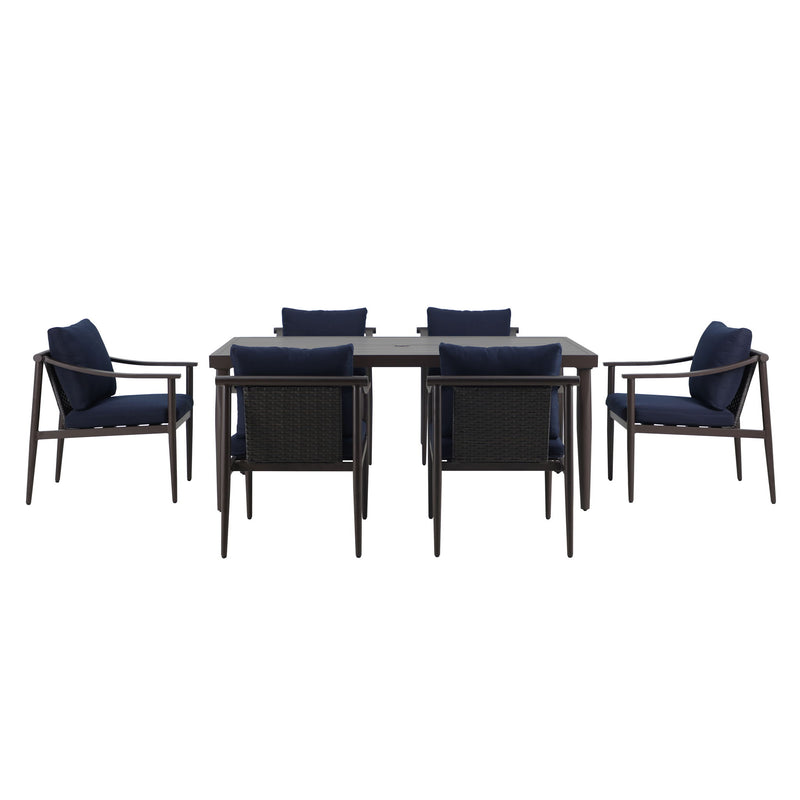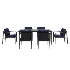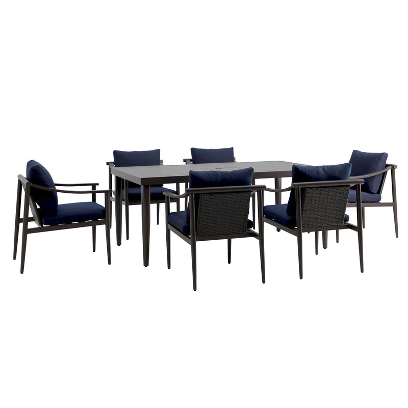 Experience outdoor dining in style with the Moana Outdoor Patio Dining Set, featuring a durable table and side chairs with comfortable blue cushions. The aluminum frames boast a baked-on powder coat finish, providing a strong foundation that resists scratches and enhances longevity. The table''s classic slatted top not only adds aesthetic appeal but also aids in water drainage, making it practical for any weather. Crafted from high-density PE wicker, the set offers the timeless look of wicker with the modern benefits of being low-maintenance, colorfast, and resistant to water, mildew, and fading. The chairs come with cushions made from our exclusive Sunduraâ„¢ fabric, a solution-dyed 100% polyester that resists fading, mildew, and moisture, ensuring vibrant color season after season. High-density 6cm foam cushions provide comfortable seating, and with a generous 72-inch length, the table accommodates up to eight people, perfect for family dinners or outdoor gatherings. The minimalist design with clean lines and a sleek dark frame allows this dining set to seamlessly blend into various outdoor settings, offering a stylish and understated look for contemporary spaces.