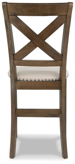 This upholstered bar stool might be simple at first sight, but a closer look reveals beauty in the details. With a distressed nutmeg finish, antiqued nailhead trim and textured polyester upholstery, it's beaming with charm. Cushioned seat ensures long, lingering meals are enjoyed in comfort.