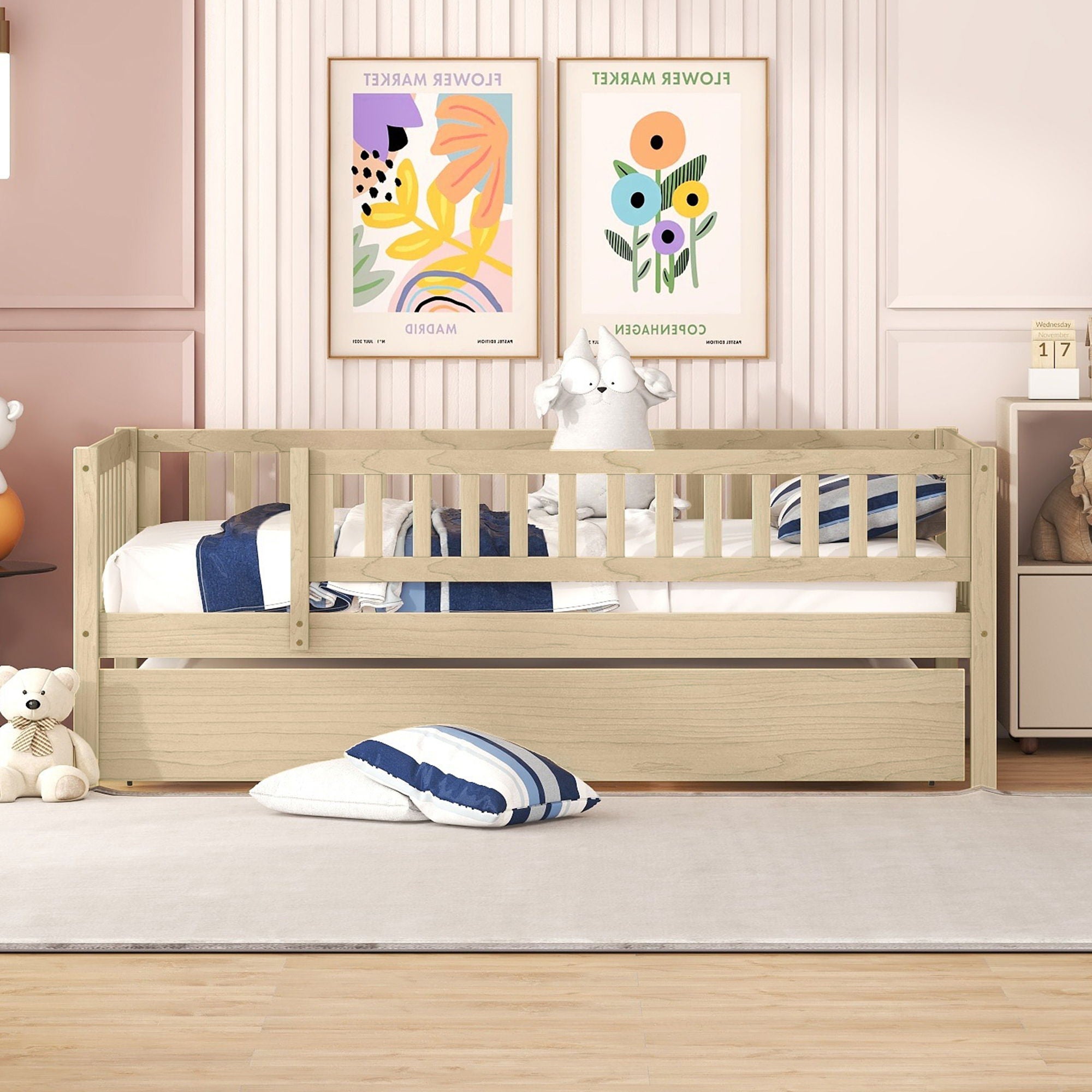 Twin Size Daybed With Trundle And Fence Guardrails - Natural