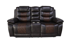Experience the perfect blend of comfort and functionality with the Nikko Dual Recliner Storage Console Loveseat with Hidden Cupholders . This loveseat, constructed with hardwood and plywood frames, ensures long-lasting durability and stability. The combination of resilient foam cushions and pocket coil support offers a luxurious, cozy place to lounge. The two-tone fabric, made from 80% polyester and 20% PU, provides the soft touch and look of leather while remaining breathable. Featuring distinctive details like nailhead trim, diamond stitch pattern seats, double wrapped headrests, and expert tailoring, this loveseat stands out in any home. Practical lifestyle features include extra storage in the center console and hidden pull-out cupholders under the armrests. Enjoy ultimate relaxation with plush pillowed arm and headrests, reclining backs, and comfortable footrests. Indulge in unparalleled comfort and style in your home with the Nikko Reclining Loveseat.