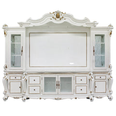Dazzling details abound in the Picardy entertainment center! Intricate raised scrolled molding and Queen Anne legs adorn each piece of this stunning set, including two side piers with beveled glass doors and touch light function, and a TV stand that accommodates up to a 75-inch flat panel TV. The elegant antique pearl color of this set is enhanced by expertly applied antique hand-brushed finish. You can complete the look with matching sofas and occasional pieces for a luxurious living area that's fit for royalty.