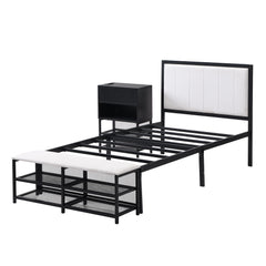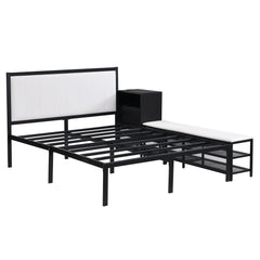 Upgrade your bedroom with this sleek Metal Platform Bed, combining industrial design with modern functionality. The bed features a durable metal frame with soft, comfortable upholstery for ultimate relaxation. With two-tier side storage shelves and a convenient wooden storage cabinet, you'll enjoy ample space to organize your essentials. The cushioned footrest above the storage shelves doubles as a cozy spot to rest your feet at the bed's end.
