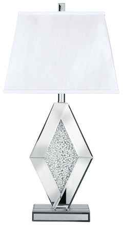 With an elegant array of mirrored glass and crystal beads, this table lamp adds a brilliant touch of wow to any setting. It's topped with a rectangular empire shade for an utterly luxe look.