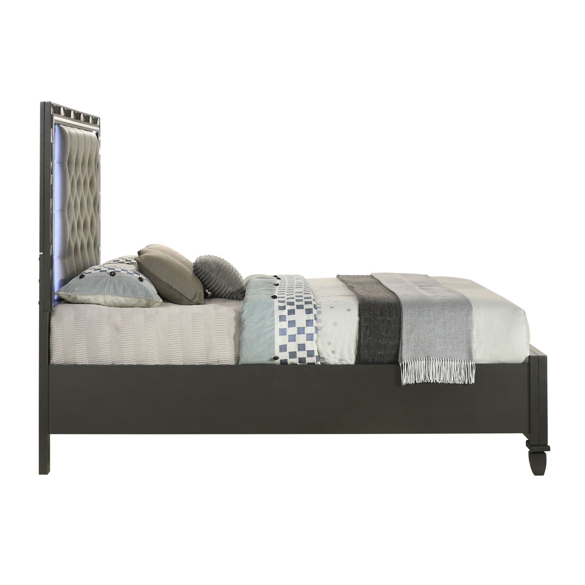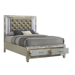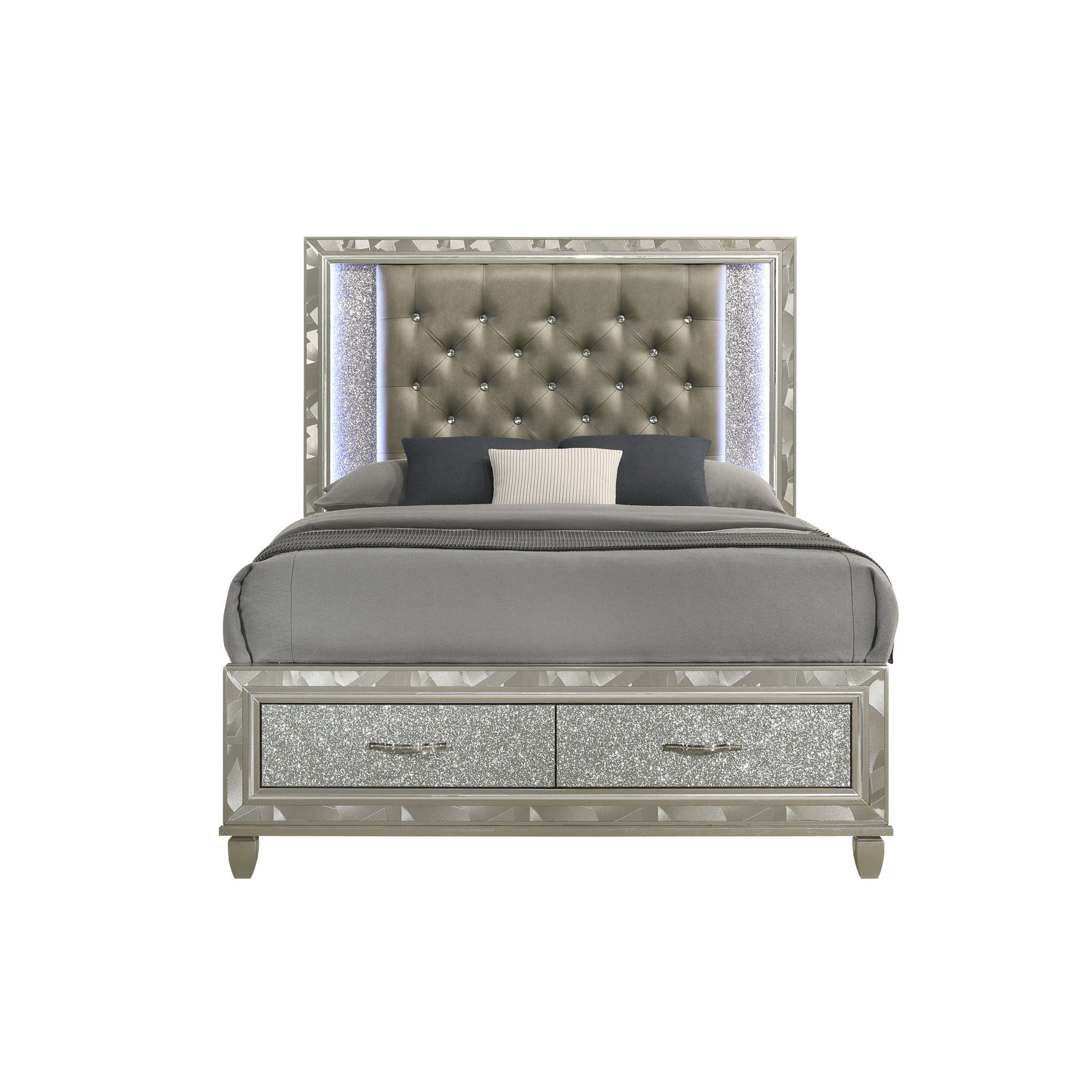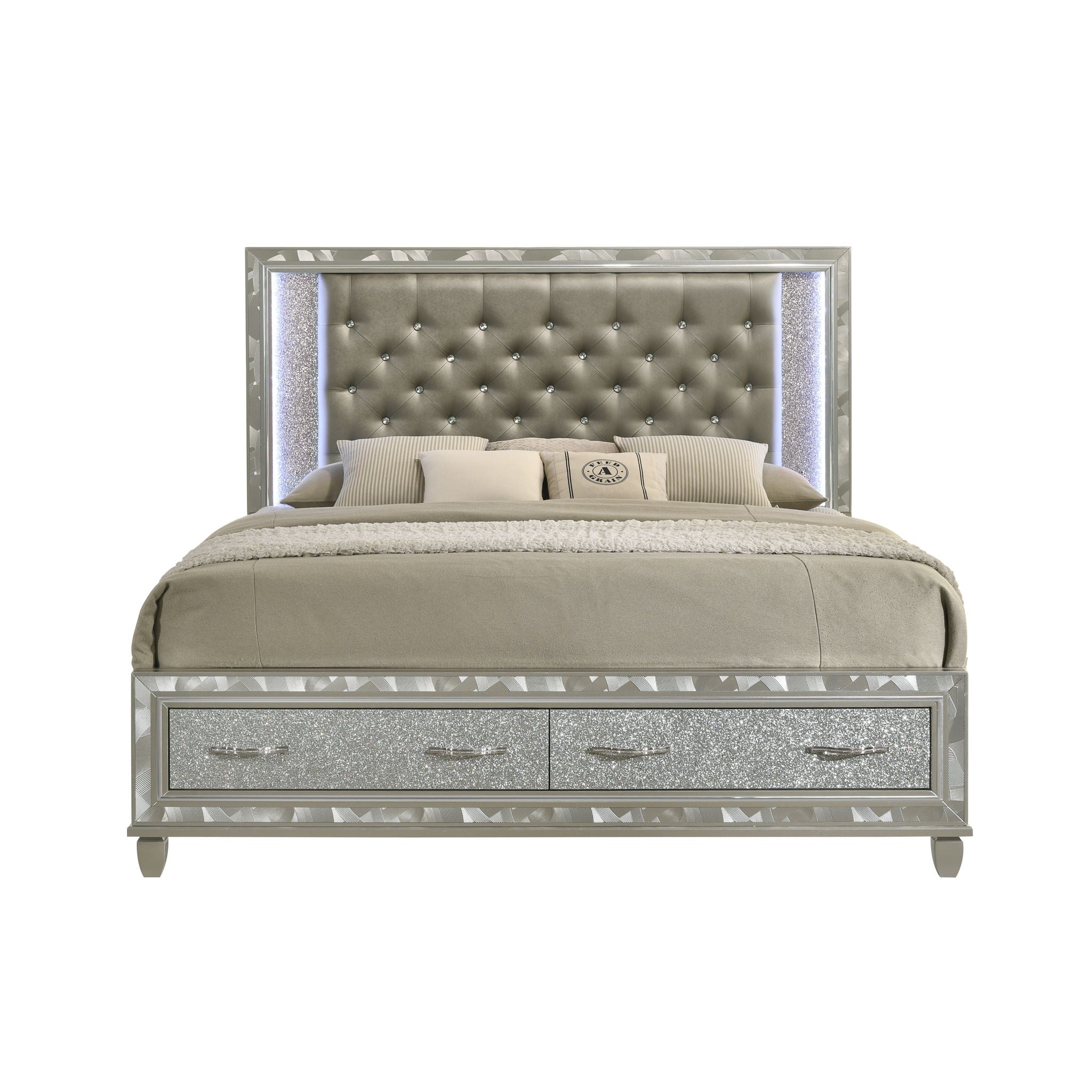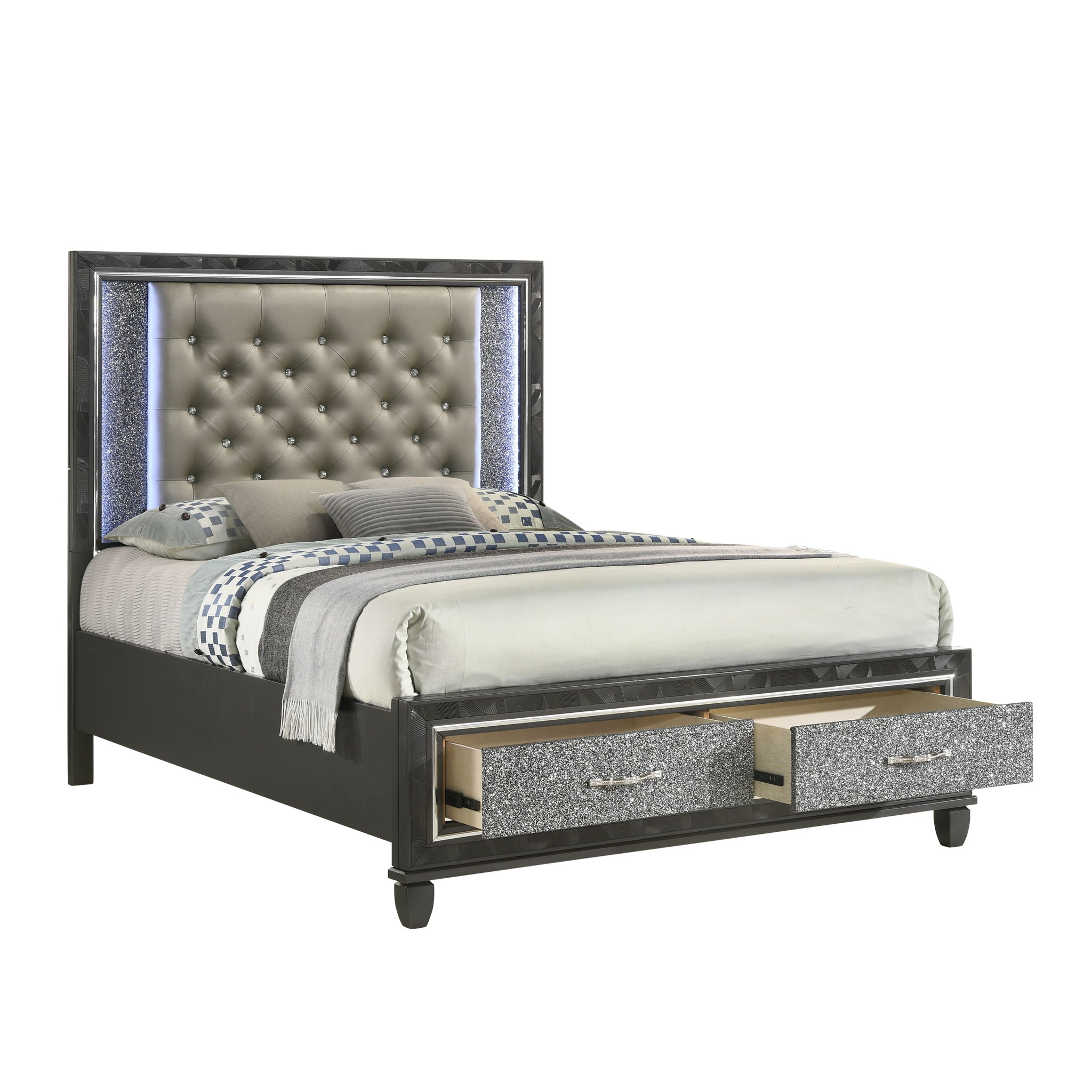 Indulge in the allure of the Radiance Storage Bed, a marvel of quality construction crafted from a blend of solid rubberwood and manufactured woods for unparalleled stability and durability. Its semi-gloss lacquer finish lends a silky, modern touch to this captivating piece. With glossy textured inlays, mylar trim, and a crushed crystal look decorative laminate framing the plushly upholstered, crystal button-tufted headboard, this bed exudes opulence. LED lighting accents your space, sparkling against the glamorous padded headboard, while two footboard storage drawers offer the perfect spot for extra blankets and pillows. Elevate your bedroom with the Radiance Storage Bed, where luxury meets functionality.