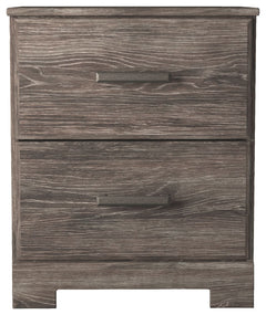 With its clean-lined look and modern attitude, this nightstand is a fresh style awakening. A warm gray hue over replicated oak grain easily complements other furniture finishes. Smooth drawer fronts with antiqued pewter-tone handles complete the aesthetic.